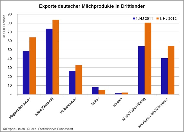 In der Halbjahresbilanz 2012 des Außenhandels stechen besonders die Exporte von Milchprodukten in Drittländer hervor.„Der Exportschlager in Drittländer sei weiterhin Käse“ ergänzt die Geschäftsführerin der Export-Union für Milchprodukte Karin Monke erfreut. Mit einer Ausfuhr von knapp 84.000 Tonnen wird das Vorjahresergebnis des ersten Halbjahres 2011 um rund 14% übertroffen. Hohe Steigerungsraten konnten vor allem hier in Richtung Russische Föderation und Libyen erzielt werden. Das ist besonders erfreulich, da in Richtung Russland im Vorjahr Einbrüche beim Export von gut 20% zu verzeichnen gewesen sind. Mit 40.000 Tonnen wird hier fast wieder das Ergebnis des Jahres 2010 erreicht.